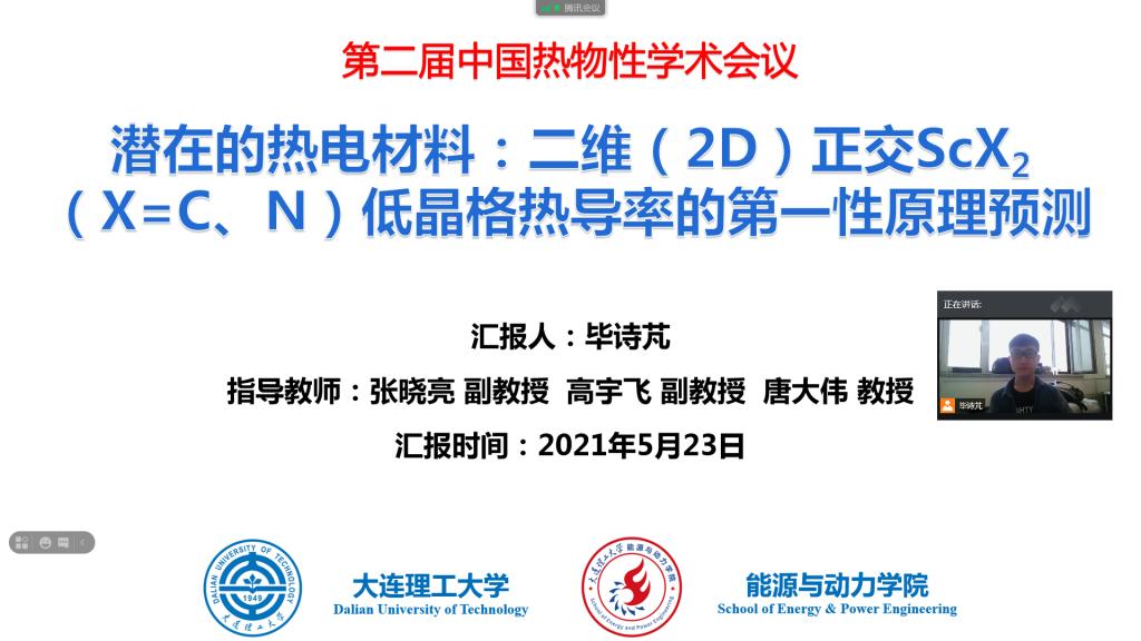 5. 毕诗芃硕士报告题目为《潜在的热电材料:二维(2D)正交ScX2 (X=C、N)低晶格热导率的第一性原理预测》。