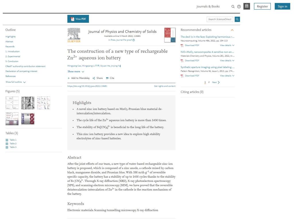 李明强副教授的指导,经过反复数十组对比实验,最终设计出一款新型水系锌离子电池,并在国际期刊Journal of Physics and Chemistry of Solids发表题为 “ The construction of a new type of rechargeable Zn2+ aqueous ion battery ” 的研究论文。