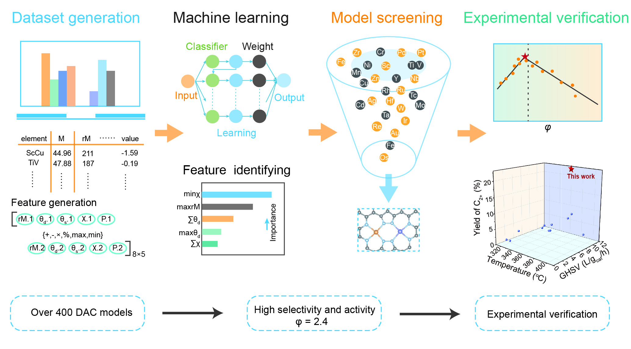 CO2加氢制多碳产物(C2+)是实现碳中和与可再生能源储存的重要途径,然而传统催化剂在活性和选择性方面仍存在较大局限。针对这一挑战,本团队提出了一种通用且可解释的描述符(φ=0.1Σθd + minχ),用于指导高性能双原子催化剂(DACs)的理性设计。该描述符仅基于金属原子的固有属性(d电子数和电负性),能够同时有效预测多种C–C耦合反应(如CH*–CH*、CO*–CO*、CHO*–CO*、CH*–CH2*)的活性与选择性,并揭示其分子轨道层面的构效关系。通过机器学习结合高通量筛选,从400余种候选催化剂中成功预测并实验验证了FeZr@NC催化剂具有优异的C2+产率(22.6%),相比现有催化剂提升达3至30倍,在稳定性测试中也表现出良好的耐久性。该描述符具备良好的普适性,适用于多种类型的C–C耦合反应,为高效催化剂的快速开发提供了新策略。该成果以“Universal and Interpretable Descriptor to Design Dual-atom Catalysts for Multi-type C–C Coupling with Ultrahigh C2+ Yield”为题发表于《Advanced Science》期刊,博士生高玉明为论文第一作者。